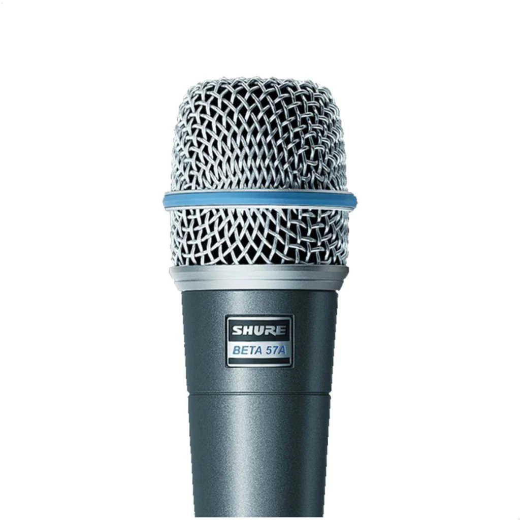 Microfone dinâmico com fio LEXSEN, modelo BETA LM B57A (provável referência ao Shure Beta 57A). Microfone de instrumento com padrão polar supercardióide e resposta de frequência otimizada para captar caixas, amplificadores, instrumentos de sopro e percussão com clareza.